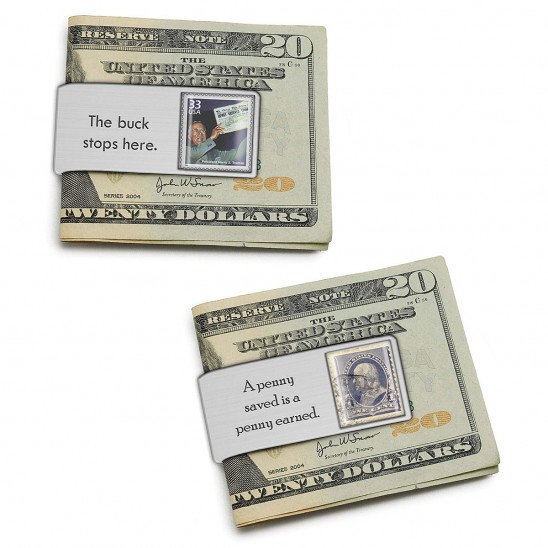 Each Vintage Stamp Money Clip features an actual United States postage stamp and a quote from the stamp’s star. Ben Franklin’s famous line: “A penny saved is a penny earned” complements an authentic used 1-cent stamp, while Harry Truman’s motto: “The buck stops here” is engraved next to a mint Truman commemorative stamp.
