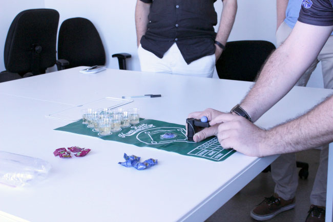 Getting the ball into any of the 4 cups in the first row counts as a “single,” which means you move your game piece one base on the mini baseball diamond. The real game will have real game pieces, but we used War Heads – which we all know are the bossest nostalgic candies of all – since the game was still in its development phase. Making it into any of the three cups behind the “singles” would be a double, the next two a triple, and the single cup furthest away is a home run. When you get a hit (sink a cup), someone from the opposing team has to drink that cup. The premise really is a combination of beer pong and baseball, but you aren’t drunkenly swinging bats around and the cups are more mini and much cuter. Also, unlike in traditional beer pong, the cups are refilled after each team’s turn.