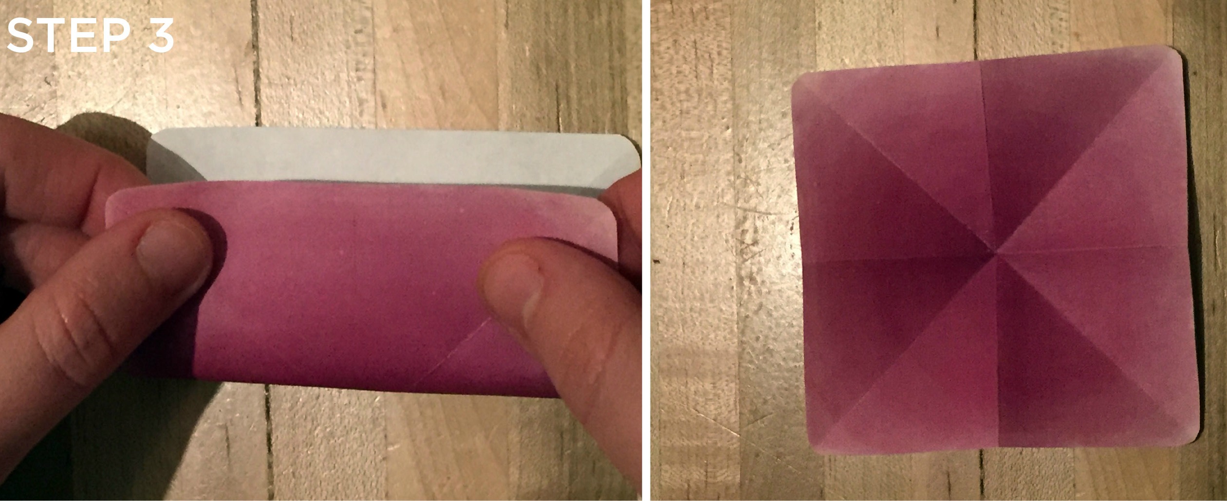 3.Orient the template so that it is a square and turn it over so that the printed side is facing down. Fold in half and unfold. Repeat in the other direction. See above image for what your our folds should look like.