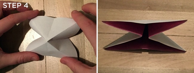 4. Hold the template in both hands with the print side down and your thumbs and middle fingers each on a corner. Gently press the middle sides in with your forefingers so that the template folds in on itself.