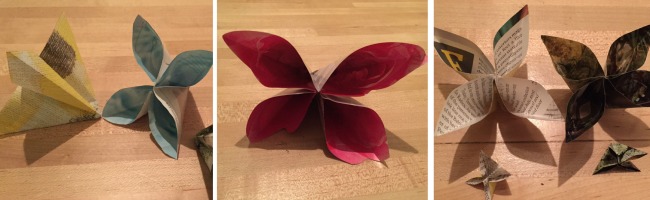 As with the roses, I was curious to see what these flowers would look like in other materials and patterns. Because of the nature of the folds, card stock wasn’t a good option (the thickness and rigidity of card stock makes it too difficult to open the petals after they are glued). I tried magazine pages but I think these would look better in a thin, double sided paper, or even newspaper.