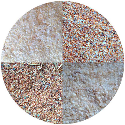 Top row: Baby White and Midnight Blue kernels; Spicy Cajun and Sweet Ginger seasonings. Bottom row: Over the Rainbow kernels (includes Midnight Blue, Amish Caramel, Royal Purple, Ruby Red and Baby White) and Red Diamond kernels; Sweet Onion and Butt Kickin’ BBQ seasonings