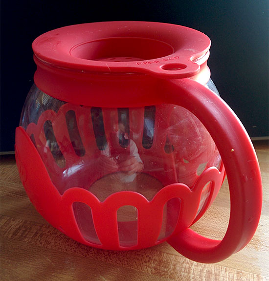 It has a heat-resistant, glass-protective shell with a red, olde-timey popcorn box-style scalloped design. The handle doesn’t get too hot to touch.