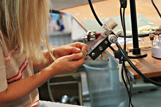 I’ve always been drawn to protecting the environment. The inspiration and motivation behind my jewelry collection inspired by the honeycomb began as I was admiring the exquisite details created by the honeybee—each comb is so naturally perfect and functional. I wanted to re-create the natural details through the lost wax technique where I could then capture them in metal. It took a lot of trial and error before I was able to create the perfect mold for the Bee Love Necklace.