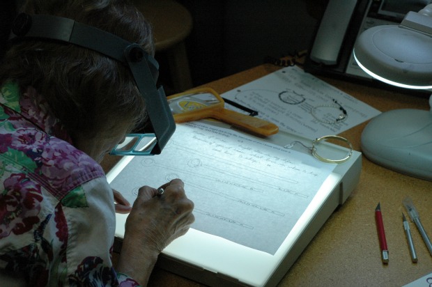 Every design begins with words often found in out-of-print books at thrift stores. The shape of the final design is a process of handwriting words on paper. (Yes, we actually make paper jewelry pieces first.) The engraving is in Jo’s distinctive handwriting using a secret process. Age-old silver smithing techniques of hand-forging, soldering, and buffing to a brilliant high polish produce the beautiful result.