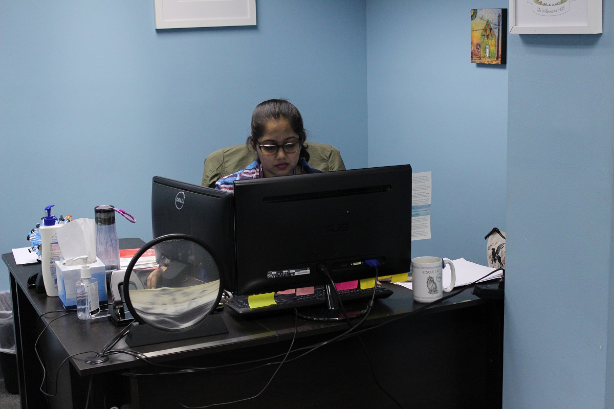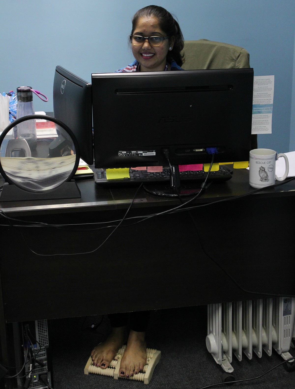 Julia Shaffie, UncommonGoods Receptionist & HR Assistant, tickles her fancy with our Handmade Wooden Foot Massager.