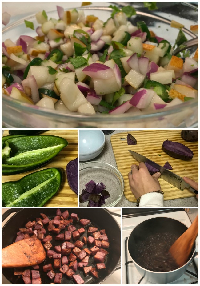 Royce and I began by planning our menu a couple of days in advance. Because of the awesome GrowNYC Fresh Food Box program, which offers fresh, locally grown produce for only $15 every Tuesday at our office in the Brooklyn Army Terminal, we had a bunch of tasty fixings on hand: Adirondack Blue potatoes, dry black beans (organic, even), fresh cilantro, Bosc pears, and huge bulbs of garlic. I hate wasting food, so we came up with a plan that would make use of the remnants of our last week’s box and, in theory, taste good: Blue potato and roasted poblano tacos with black beans and pear salsa, plus cotija cheese, hot sauce, and sour cream, all staples in our household.