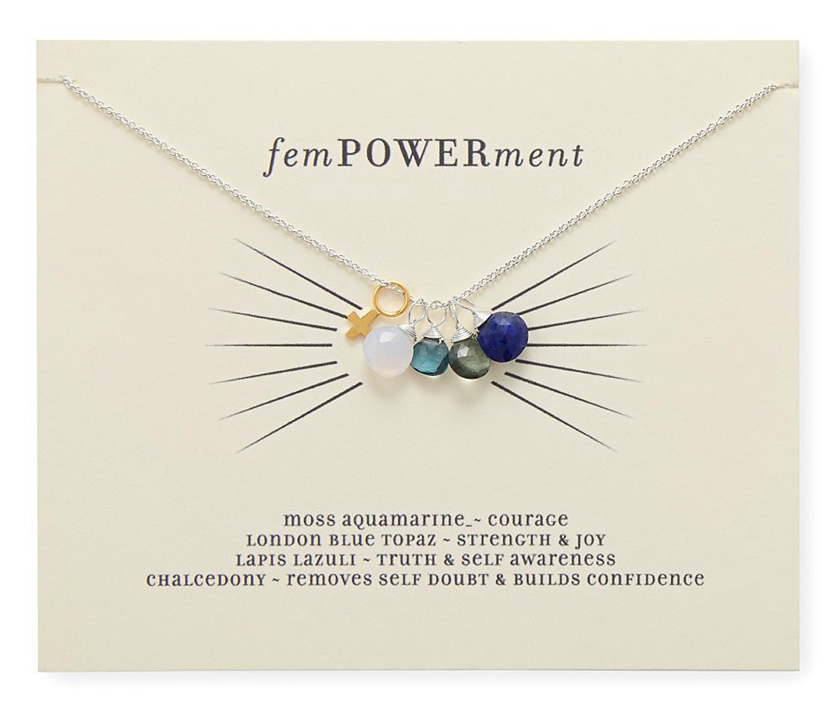 The focal point of this empowering necklace may be its four bluish stones, but the subtle woman symbol and what those stones represent make it more than just a pretty gift.