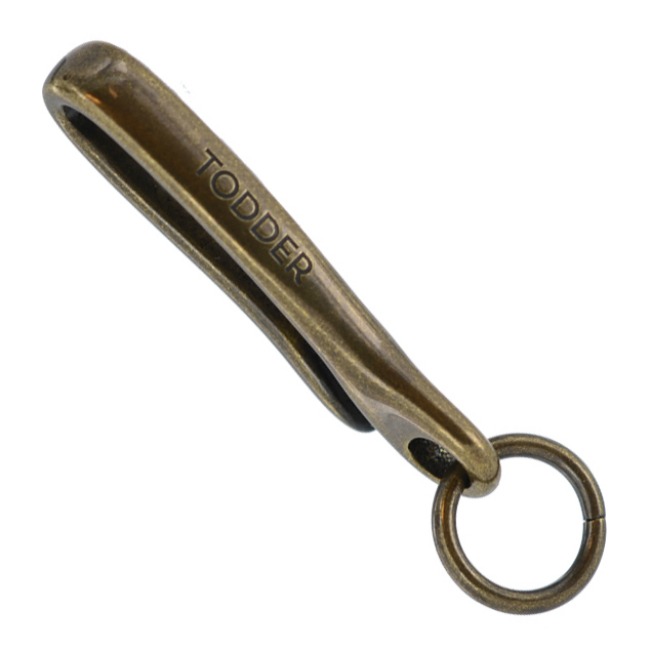Brass with a high copper content forms a protective oxide layer—more poetically called patina—on its surface that forms a barrier against further corrosion. Patina on pieces like this fishhook key ring also protects against the shock of that brand-new, super-brassy look. Instead, you get the nostalgic appeal of antique brass hardware without waiting for years of wear. | Fishhook Brass Keyring