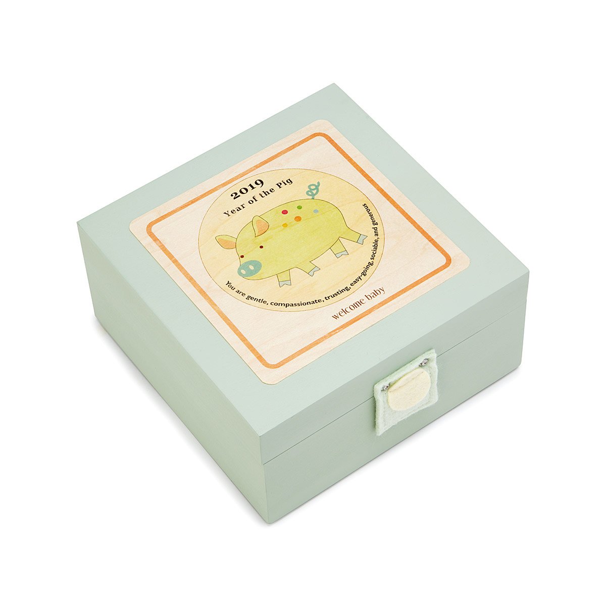 Chinese tradition holds that babies born during the year of the pig (2/16/2019—2/4/2020) will be optimistic and energetic, but also gentle and focused. Mark your new arrival's unique character traits as they grow with this adorable keepsake box. Designed by Kerri Lee, the felt-lined wooden design comes with a tiny envelope for holding a lock of hair along with space to write your baby's name and birth date. It's a charming place to keep their first pair of booties, a favorite toy, or pictures from their first year. Handmade in Long Eddy, New York.