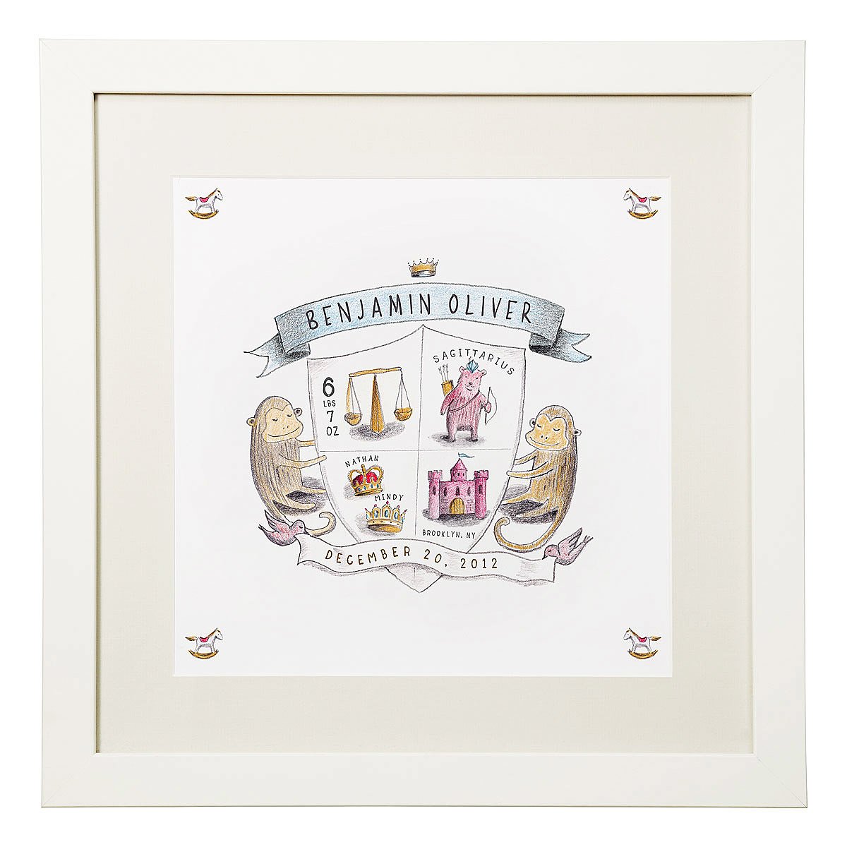 Illustrated in the iconic style of a coat of arms, this keepsake print honors a child's birth in a regal, timeless fashion, but with a few playful, contemporary twists. Patricia Carlin's charming, colored-pencil drawings depict adorable toys and animals surrounding a shield that holds special details about the new arrival, including his or her weight, zodiac sign, parents' names, and the town and state in which the baby was born. Designed in Pennsylvania by Patrica Carlin. Printed and framed in Oregon. Ready to hang (wire hanger).