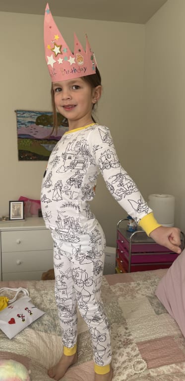 I was so pleasantly surprised by these pajamas! They're pure white with whimsical fairytale outlines that my three-year-old gets to color in herself with the included markers. The markers are bold, beautiful, and super easy for little hands to use—and the best part is they wash right out in the laundry so she can start fresh again. It's such a fun and creative activity, and the pajamas are soft and comfy too. A perfect mix of playtime and bedtime!