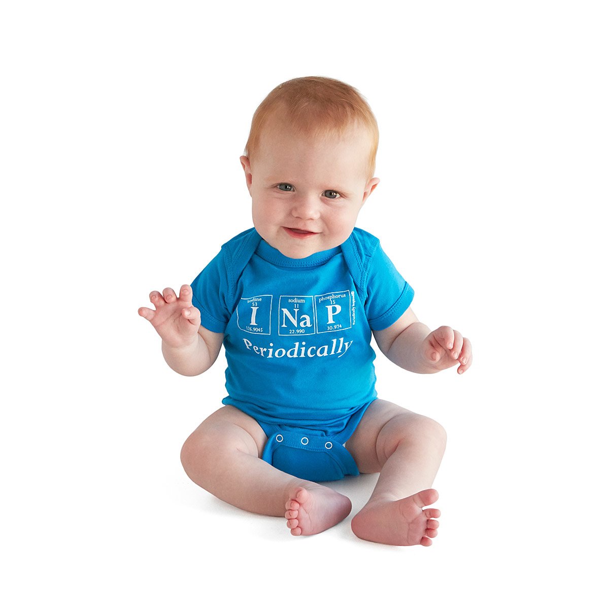 Bedtime battles, cranky campers, and full-blown meltdowns—parenting is far from an exact science. But the elemental certainty of the periodic table brings a playful touch to this nerdy babysuit. Atomic symbols for iodine, sodium, and phosphorus spell out every parent's favorite phenomenon: naptime. The 100% cotton coverall with three-snap bottom closure makes great gear for budding Einsteins and a geek-worthy baby shower gift. Garment made in India. Designed by Courtney Church and printed in Pawtucket, Rhode Island.