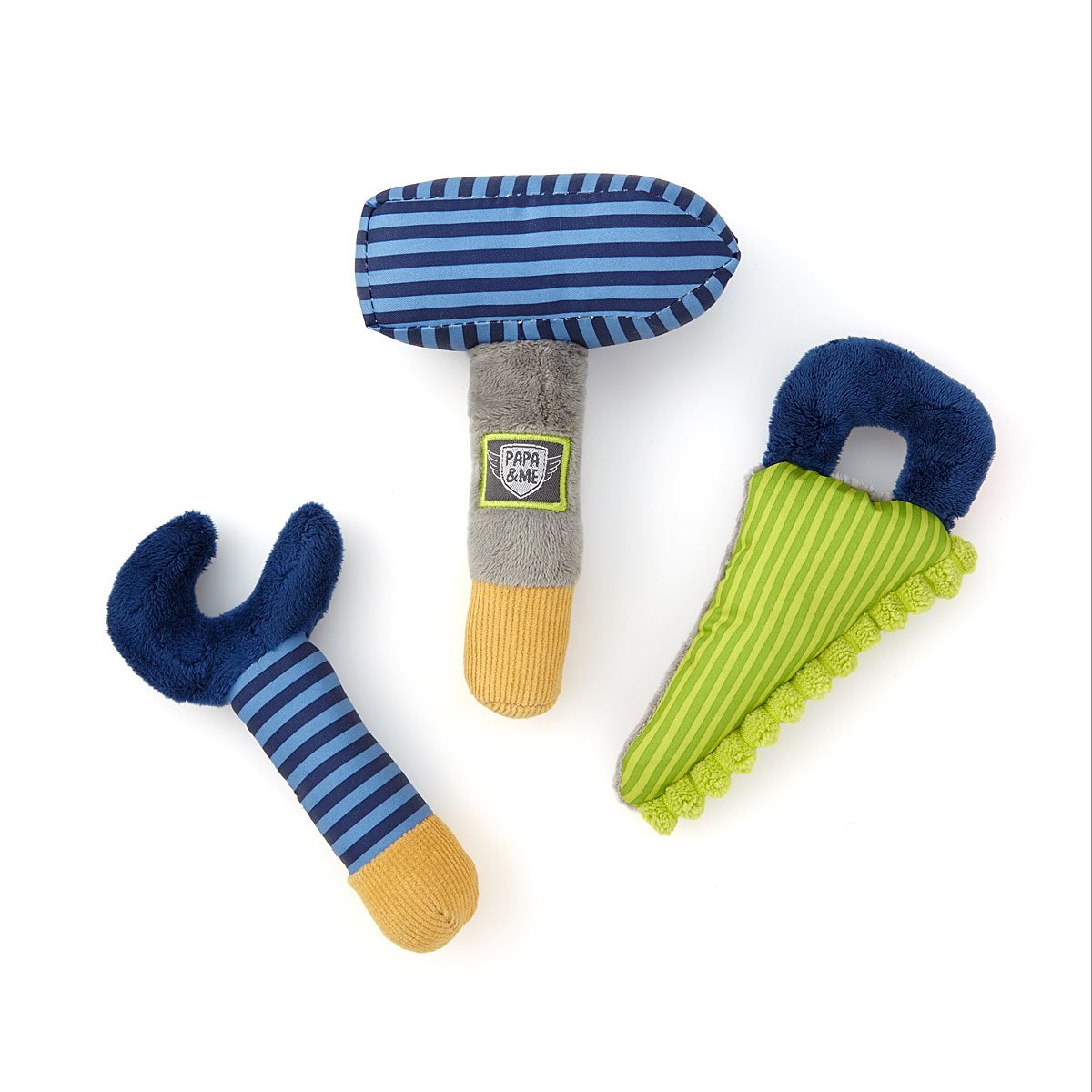 Every great handyman or handywoman must have started out as a handybaby, right? This set of plush tools will certainly have them tinkering around. Each one is a tool for mental and dexterity development, and the gentle crinkling sound they make when squeezed will keep little ones active and engaged. Try clipping them to a stroller or shopping cart as you're tooling around town, or from a crib rail or car seat handle to help them transition to sleep. Made in China.