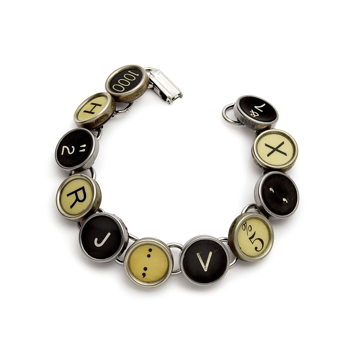 This bracelet speaks for itself: Made from the classic round keys of retired typewriters, the clever accessory will spell out any style. The 11 elegant keys are joined by sterling silver loops, and close with a classic clasp.